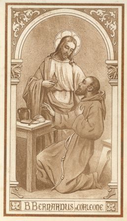 Un jour elle se réveilla et Bernard converti entra chez les Capucins. Ses débuts dans la carrière de la pénitence furent semés de si redoutables tentations qu'il allait céder au découragement, lorsque N.-S. lui apparut, trempa dans la plaie de son côté un morceau du pain de la quête et le rendit à Bernard qui, en le goûtant, se sentit le cœur inondé de délices et rempli d'une nouvelle ardeur pour la pénitence.