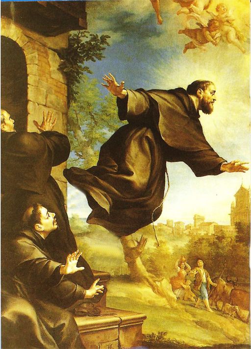 On le représente en lévitation, vêtu du froc des frères mineurs conventuels.