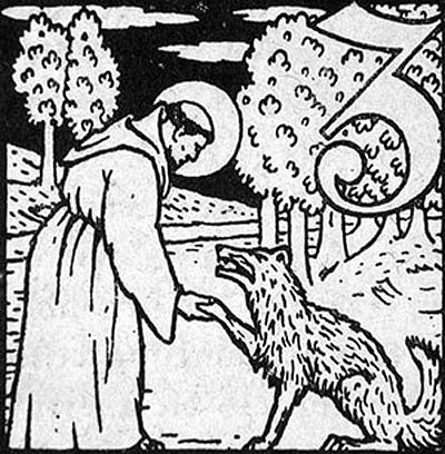 C'est pourquoi saint François ayant pitié des gens de cette ville, voulut sortir face à ce loup, bien que les habitants le lui déconseillassent complètement ; et ayant fait le signe de la sainte croix, il sortit des murs avec ses compagnons , mettant en Dieu toute sa confiance. Et les autres hésitant à aller plus loin, saint François s'achemina vers le lieu ou était le loup. Et voici que sous les yeux de beaucoup habitants qui étaient venus voir ce miracle, le loup arriva la gueule ouverte, à la rencontre de saint François ; et s’approchant de lui saint François fit sur lui le signe de la croix l'appela et lui parla ainsi : « Viens ici, frère loup ; je te commande de la part du Christ de ne faire de mal ni à moi ni à personne. » Chose admirable ! Aussitôt que saint François eut tracé la croix, le terrible loup ferma la gueule et cessa de courir ; et, au commandement, il vint, paisible comme un agneau, se jeter couché aux pieds de saint François.